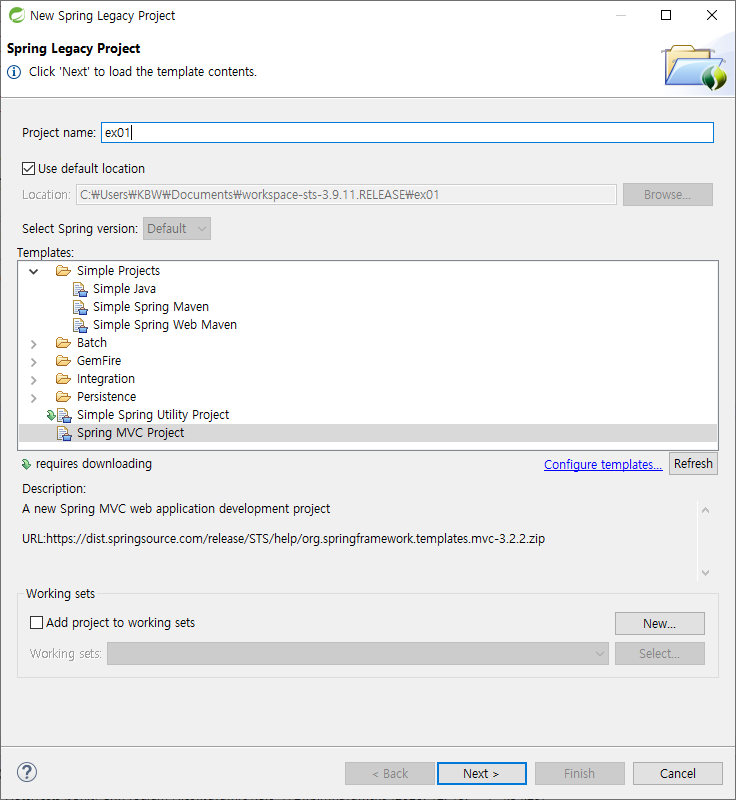 아래의 Template에서는 'Spring MVC Project'를 선택한다.