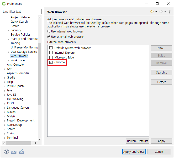 아래와 같은 설정을 통해 외부 브라우저인 크롬을 사용해주도록 하자.
