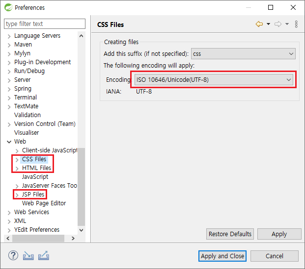 'Web' 카테고리 아래의 CSS Files, HTML Files, JSP Files의 인코딩 방식을